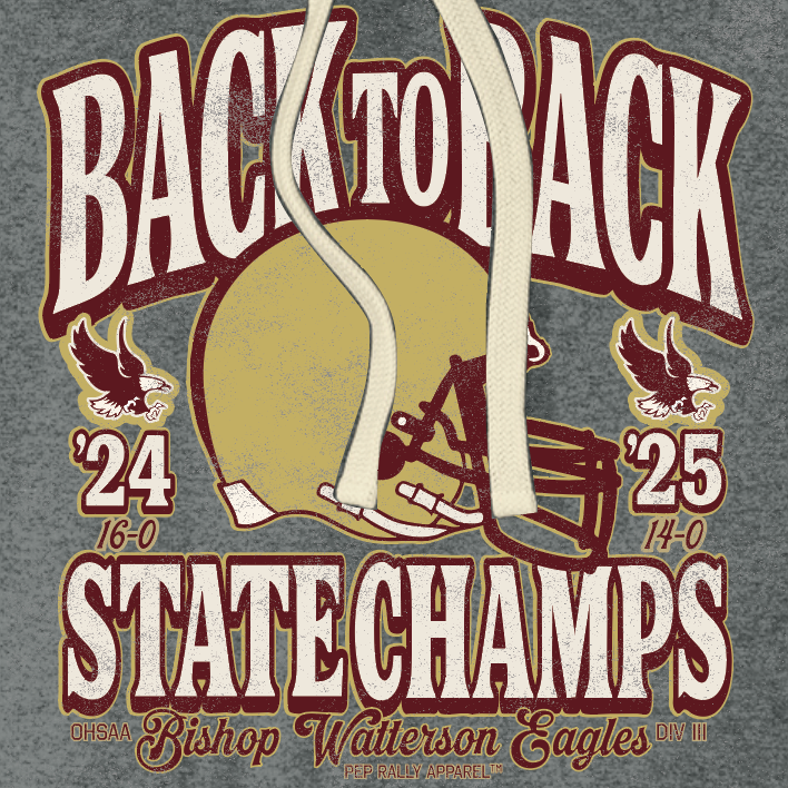 BISHOP WATTERSON Eagles did it! Back to Back Div 3 State Champs!! Celebrate with some fresh gear from Pep Rally Apparel!! Unisex sizing. This PREORDER WILL RUN FOR 2 WEEKS thru DEC 22nd. We will begin printing after the close of the sale!! Orders will be shipped after the new year!! GO EAGLES!!