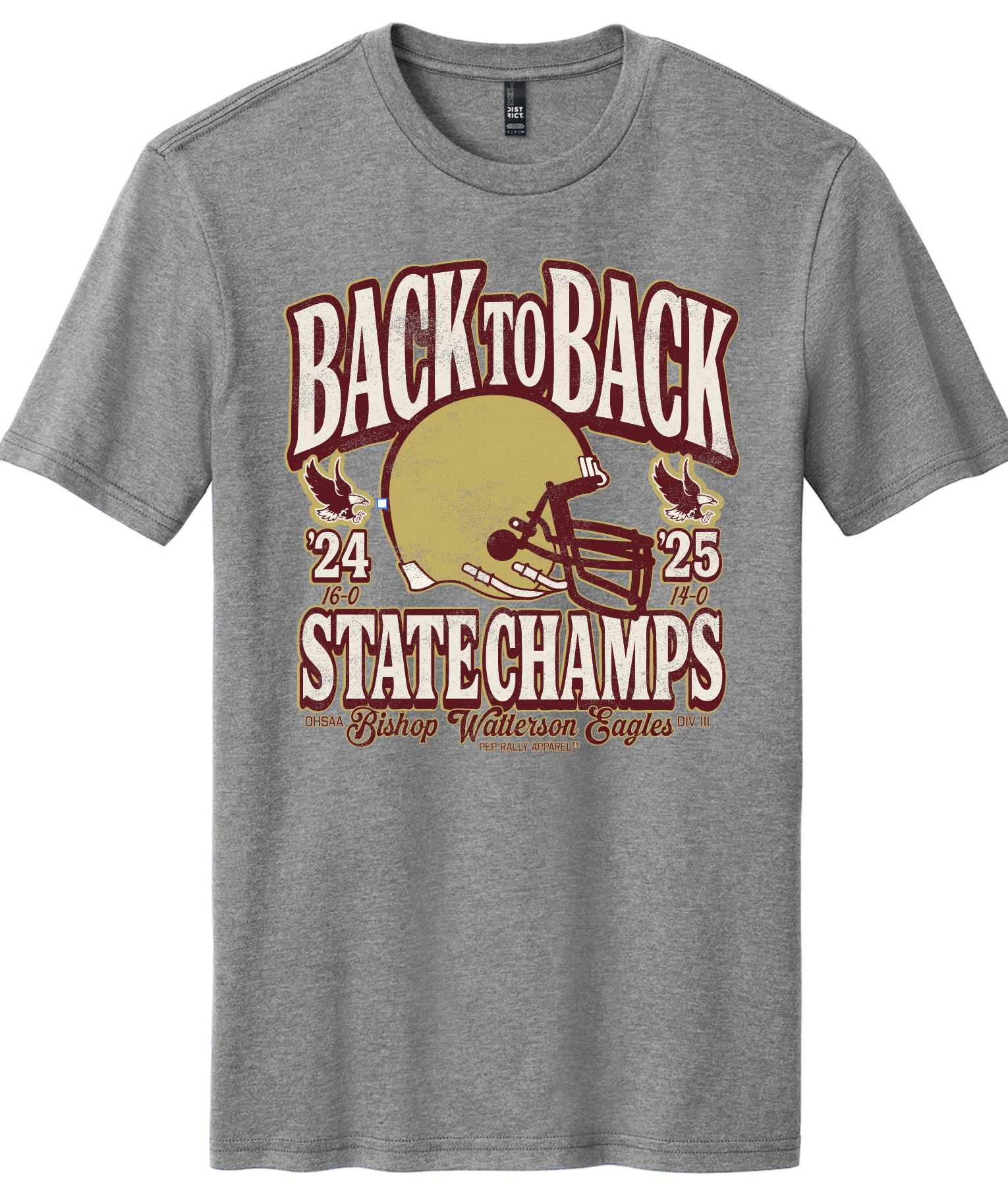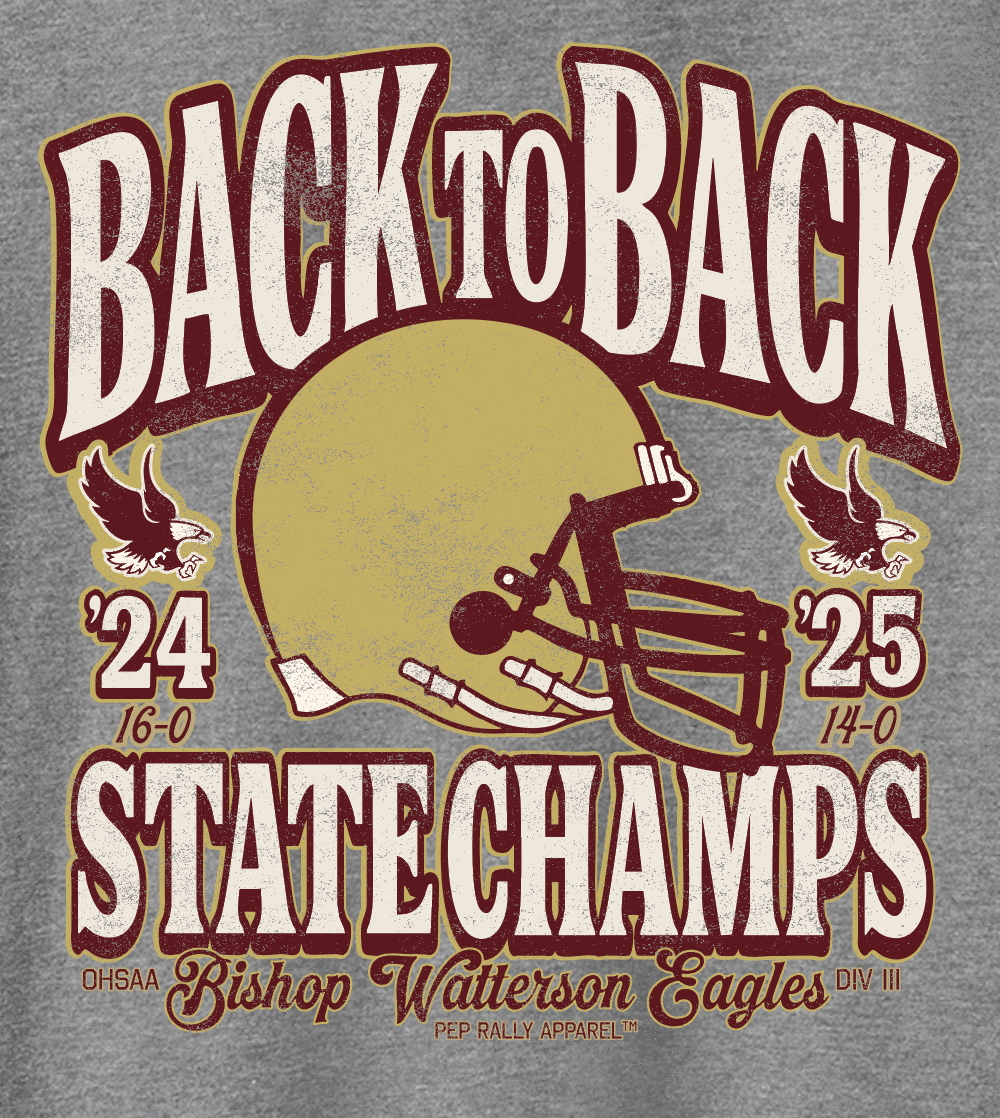 BISHOP WATTERSON Eagles did it! Back to Back Div 3 State Champs!! Celebrate with some fresh gear from Pep Rally Apparel!! Unisex sizing. This PREORDER WILL RUN FOR 2 WEEKS thru DEC 22nd. We will begin printing after the close of the sale!! Orders will be shipped after the new year!! GO EAGLES!!